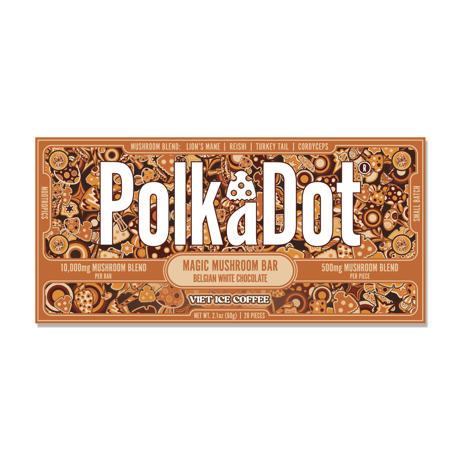 Experience a new level of indulgence with Viet Ice Coffee PolkaDot Magic Mushroom Belgian White Chocolate. Inspired by the bold and refreshing taste of Vietnamese iced coffee, this chocolate combines premium Belgian white chocolate with a magical twist. Perfect for those who crave a unique and flavorful adventure in every bite.